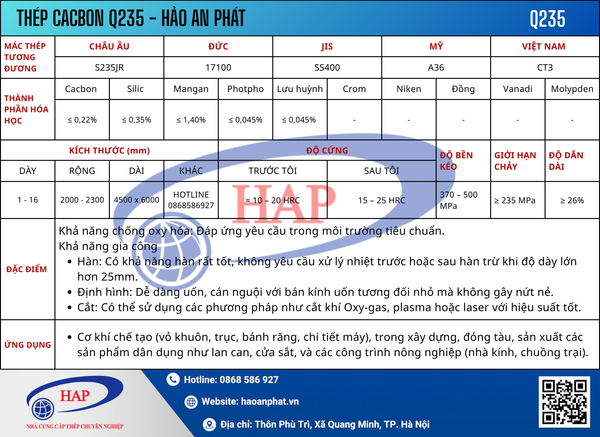 Mác thép: Q235 (các cấp: Q235A, Q235B, Q235C, Q235D)