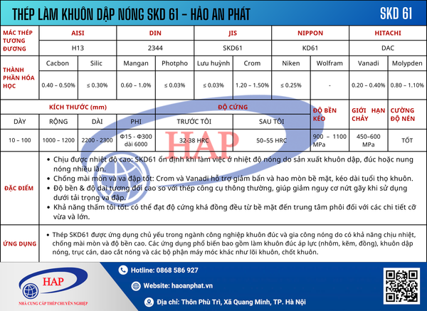 Thép SKD61 sản xuất theo tiêu chuẩn KS (Hàn Quốc) là một loại thép công cụ có hàm lượng hợp kim cao, nổi bật với khả năng chịu nhiệt, chống mài mòn tốt và độ bền vượt trội. Khi được cung cấp bởi Hảo An Phát, thép SKD61 trở thành lựa chọn lý tưởng cho các khuôn dập nóng, chi tiết máy yêu cầu độ cứng lớn và duy trì hiệu suất trong môi trường làm việc khắc nghiệt. Sản phẩm này cân bằng giữa giá thành và chất lượng, giúp doanh nghiệp giảm chi phí bảo trì, gia tăng tuổi thọ khuôn mẫu.